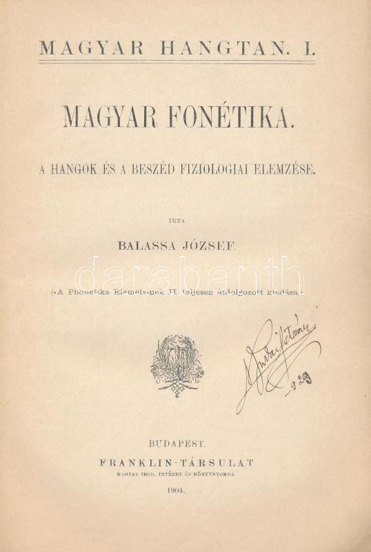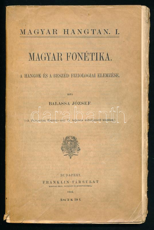 Bp. 1904. Franklin. IV, 166p. (26 szövegközti rajzzal) Magyar Hangtan I. Kiadói papírborítóval, fűzés néhol elvált