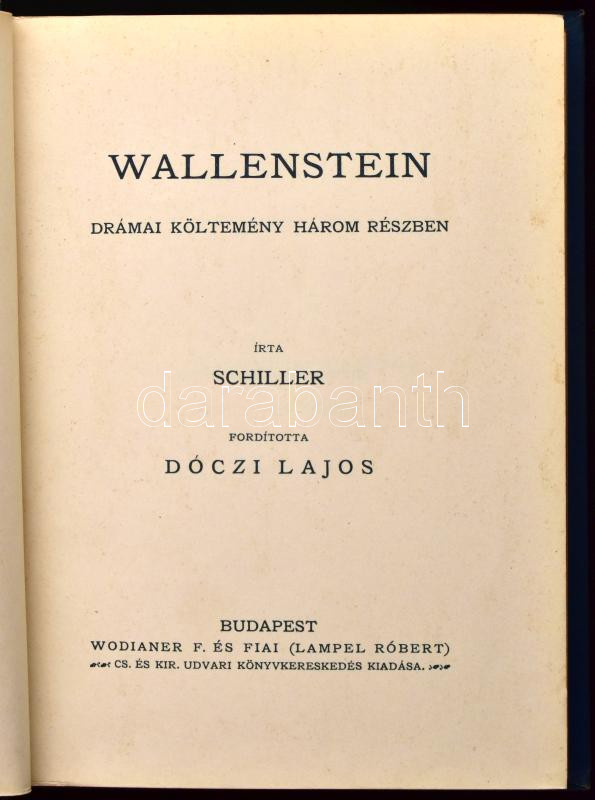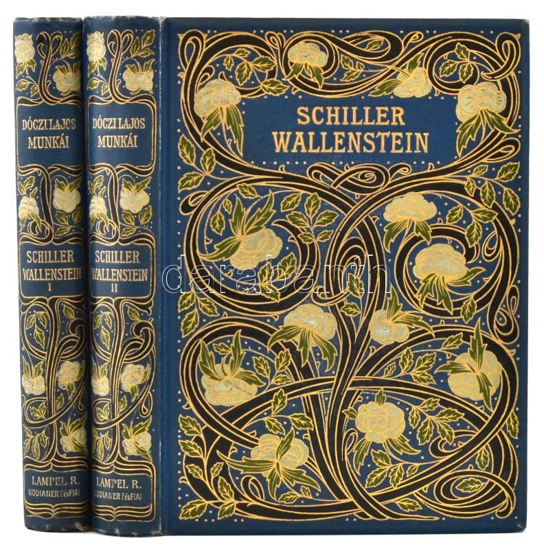 Dóczi Lajos munkái VIII-IX. kötet: Schiller: Wallenstein I-II. kötet. Drámai költemény három részben. Ford.: Dóczi Lajos. Bp., én., Lampel R. (Wodianer F. és Fiai.), Hornyánszky Viktor-ny. Kiadói szecessziós aranyozott, festett, illusztrált egészvászon-kötés, Gottermayer-kötés, aranyozott lapélekkel, a borítón kis kopásnyomokkal, jó állapotban.