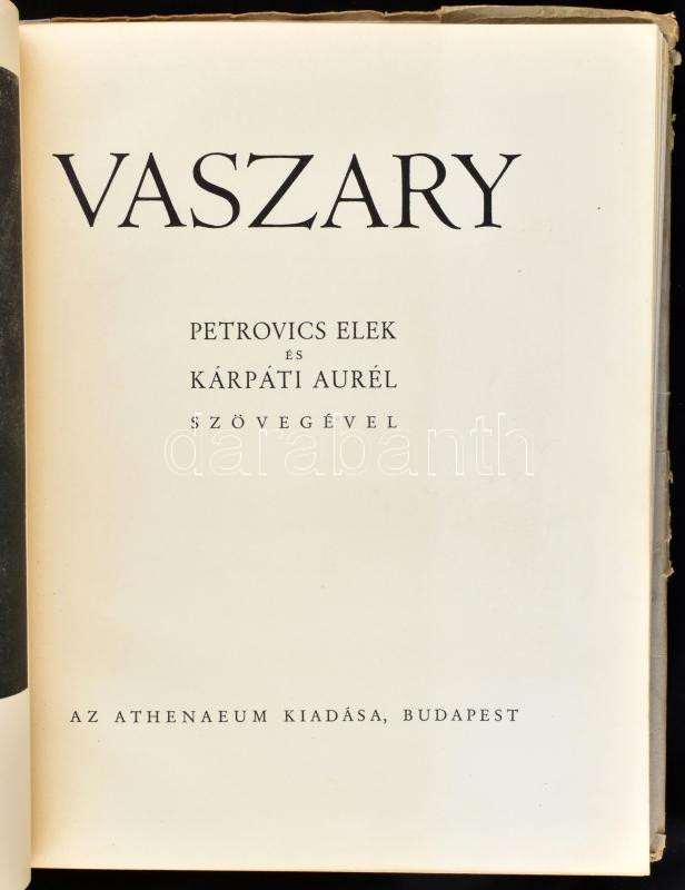 Petrovics Elek - Kárpáti Aurél: Vaszary. Bp., [1941], Athenaeum, XXV+(1) p.+126 t.+(2) p. Gazdag egészoldalas képanyaggal illusztrálva. Kiadói egészvászon-kötés, illusztrált kiadói papír védőborítóban, a papírborító és több képtábla sérült, ragasztott.