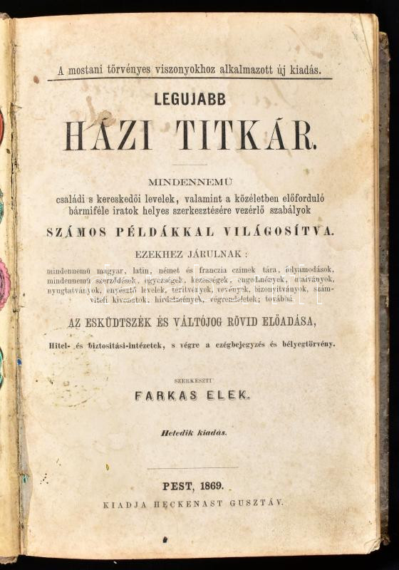 Farkas Elek (szerk.): A legujabb házi titkár. Pest, 1869, kiadja Hecke... https://www.darabanth.com/de/438-Fernauktion/438.0/Bucher/Bucher-Geschichte~1000011/Farkas-Elek-szerk-A-legujabb-hazi-titkar-Pest-1869-kiadja-Heckenast-Gusztav-Korabeli-kiss~II2864517