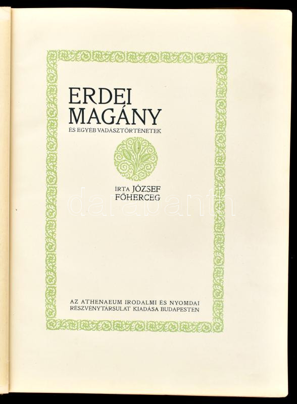 József főherceg: Erdei magány és egyéb vadásztörténetek. Bp., 1913, Athenaeum, 1 t. + 243+(1) p. + 12 t. Első kiadás. Szövegközi és egészoldalas, fekete-fehér fotókkal. A könyvdíszeket Neogrády Antal és Hanuszik László rajzolta. Kiadói díszes, aranyozott, festett egészvászon-kötés, a gerincen sérüléssel, egyébként jó állapotban.