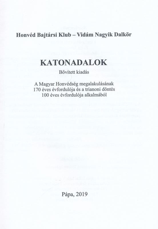 Katonadalok, kottával Pápa, 2019. Városi könyvtár. Kiadói papírkötésbe... https://www.darabanth.com/de/438-Fernauktion/438.0/Bucher/Bucher-Militaria~1000012/Katonadalok-kottaval-Papa-2019-Varosi-konyvtar-Kiadoi-papirkotesben-95-plus-6-p~II2853525
