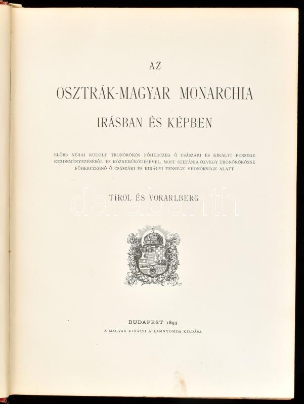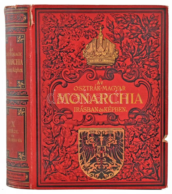 Az Osztrák-Magyar Monarchia írásban és képben X. kötet: Tirol és Voralberg. Bp., 1893, M. Kir. Államnyomda, XII+594 p. Gazdag egészoldalas, és szövegközti képanyaggal illusztrált. Kiadói dúsan aranyozott, festett egészvászon-kötés, Gottermayer-kötés, márványozott lapélekkel, kissé kopott borítóval, sérült gerinccel, az elülső táblán sérülésnyommal, egy hiányzó táblával.