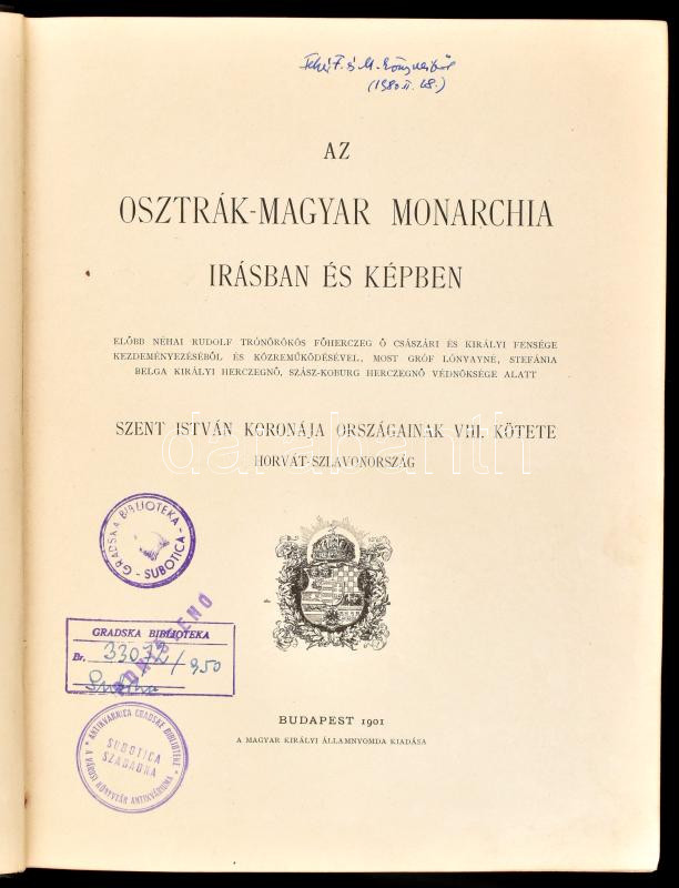 Az Osztrák-Magyar Monarchia írásban és képben XXI. kötete: Szent István Koronája országainak VIII. kötete: Horvát-Szlavonország. Bp., 1901, M. Kir. Állami Nyomda,XII+2+574+2+14 (utószó) p. Gazdag egészoldalas és szövegközti képanyaggal illusztrált. Korabeli félbőr-kötésben, kopott borítóval, intézményi bélyegzőkkel és címkékkel.