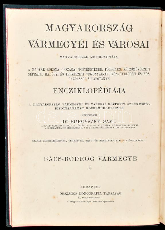 Hont vármegye és Selmeczbánya sz. kir. város. Magyarország vármegyéi és városai - Magyarország monográfiája. Szerk.: Dr. Borovszky Samu. Bp., [1906], Országos Monográfia Társaság (Wodianer F. és Fiai-ny.). Egészoldalas, fekete-fehér és színes képekkel, kihajtható térképekkel. Kiadói dekoratív, aranyozott, festett, dombornyomott egészvászon-kötés, festett lapélekkel. A gerincen apró sérülésekkel, a hátsó borítón kisebb folttal, egyébként jó állapotban.