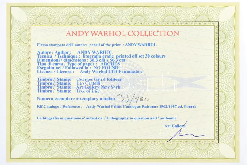 Andy Warhol (1928-1987): Campbell soup. Ofszet litográfia, papír, jelzett a nyomaton. Kézzel sorszámozott 33/100, jelzett a nyomaton. Georges Israel editeur - Leo Castellli New York, szárazpecséttel, tanúsítvánnyal / Ofset lithography on paper, with certificate 41x27 cm