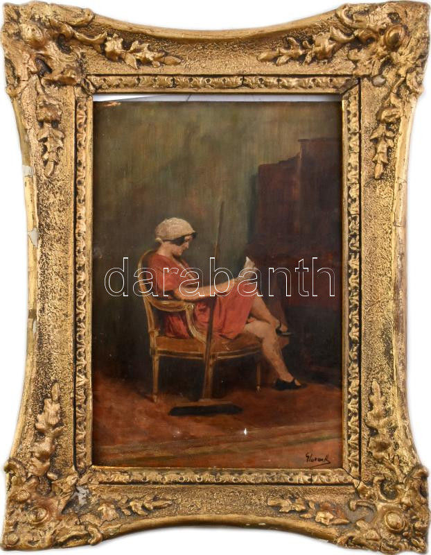 Beschreibung: Glatter Ármin (1861-1931): Olvasó hölgy. Olaj, rétegelt fa, jelezve jobbra lent, sérült keretben, 29x21 cm