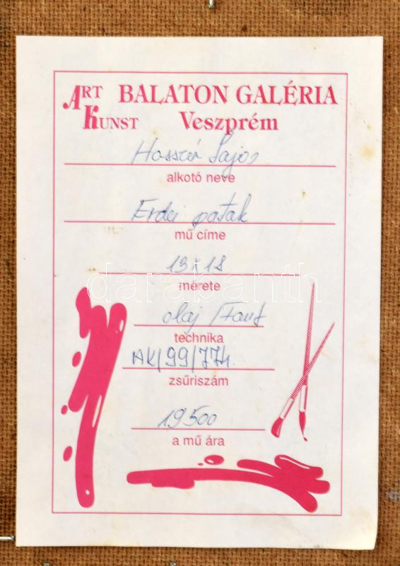Hosszú Lajos (1944-): Erdei patak. Olaj, farost, jelzett. Hátoldalán B... https://www.darabanth.com/de/438-Fernauktion/438.0/Gemalde-und-Grafiken/Gemalde-und-Grafiken~500001/Hosszu-Lajos-1944-Erdei-patak-Olaj-farost-jelzett-Hatoldalan-Balaton-Galeria-cimkejev~II2867172
