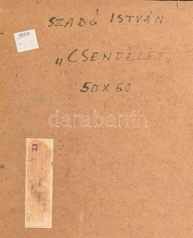 Szabó István (1927 - 2001): Csendélet farost, olaj, kissé sérült keret... https://www.darabanth.com/de/438-Fernauktion/438.0/Gemalde-und-Grafiken/Gemalde-und-Grafiken~500001/Szabo-Istvan-1927-2001-Csendelet-farost-olaj-kisse-serult-keretben-50-x-60-cm~II2872974