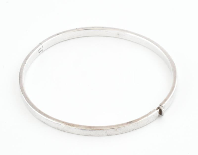 Ezüst(Ag) sima felületű kapcsos karperec, jelzett, 6,1×5,7 cm, nettó: ... https://www.darabanth.com/de/438-Fernauktion/438.0/Juwellen-und-Kunstobjekte-aus-Edelmetall/Juwellen-und-Kunstobjekte-aus-Edelmetall~1000028/EzustAg-sima-feluletu-kapcsos-karperec-jelzett-6-1C3975-7-cm-netto-6-4-g~II2860813