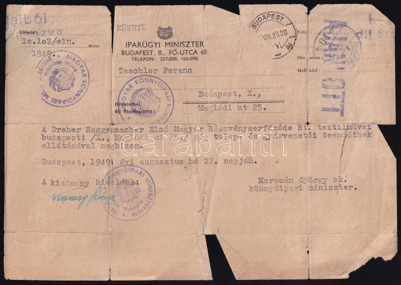 1949 Bp., Marosán György könnyűipari miniszter által kiadott kinevezés, a Dreher-Haggenmacher Rt. textilművei telep- és gyárvezetői pozíciójára, bélyegzésekkel, a lap sérült