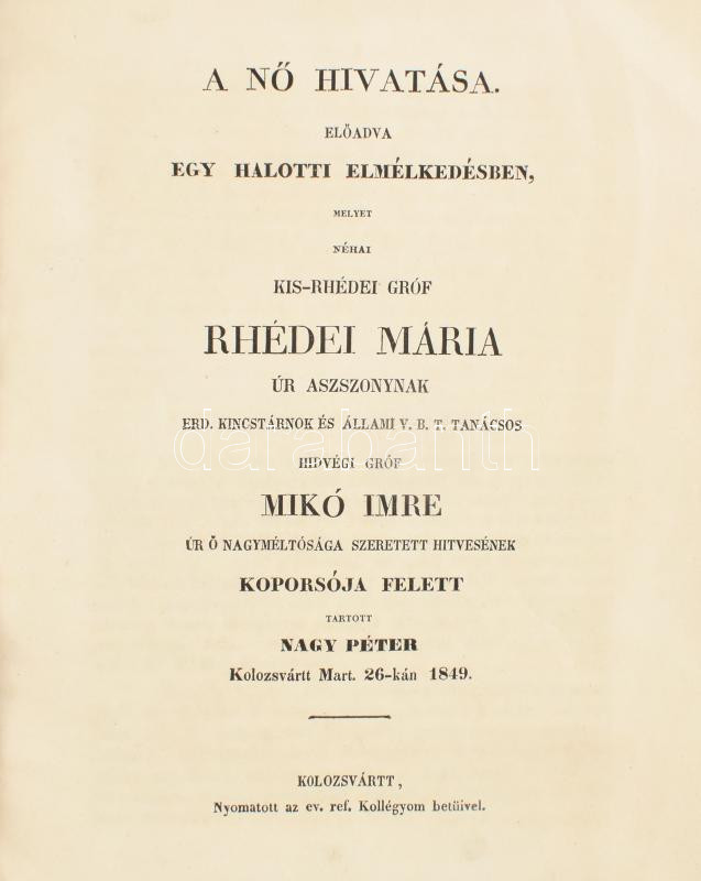 1849 Nagy Péter: Egy nő hivatása előadva egy halotti elmélkedésben ...... https://www.darabanth.com/de/438-Fernauktion/438.0/Kunst-Dokumente-andere-Sammelgebiete/Drucksachen~1000005/1849-Nagy-Peter-Egy-no-hivatasa-eloadva-egy-halotti-elmelkedesben-Rhedei-Maria-Kolozsv~II2862923