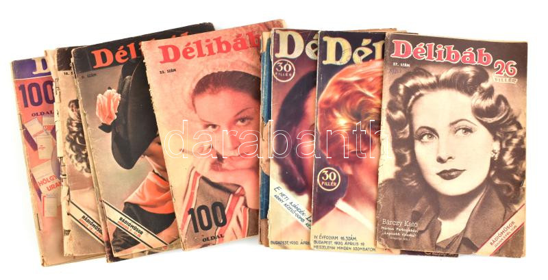 1930-1943 Délibáb c. színházi hetilap 13 db száma ( IV. évf. 15.,16. sz. ; X. évf. 15., 33., 40. sz., XI. évf. 16., 31 sz.; XIII. évf. 9. sz.;XVII. évf. 27.,29. sz.) a címlapokon a kor híres színésznőivel, vegyes állapotban, intézményi bélyegzőkkel, közte 3 hiányos számmal is.