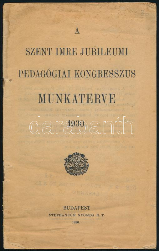 1930 A Szent Imre Jubileumi Pedagógiai Kongresszus munkaterve. Bp., 1930, Katholikus Pedagógiai Kongresszus (Stephaneum-ny.), 36 p. Kiadói tűzött papírkötés, kissé foltos, sérült borítóval.
