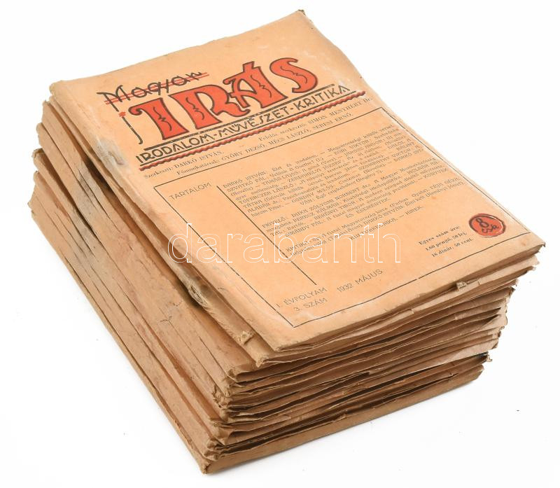1932-1933 Magyar Írás, irodalmi-művészeti-kritikai folyóirat, 13 db szám: I. évf. 3-9. sz., II. évf. 1., 2., 5-6., 7., 8., 10. sz. Szerk.: Darkó István, Simon Menyhért. Benne Mécs László, Szabó Lőrinc és mások írásaival; Buday György fametszetével. Vegyes állapotban, kisebb sérülésekkel, ázásnyomokkal.