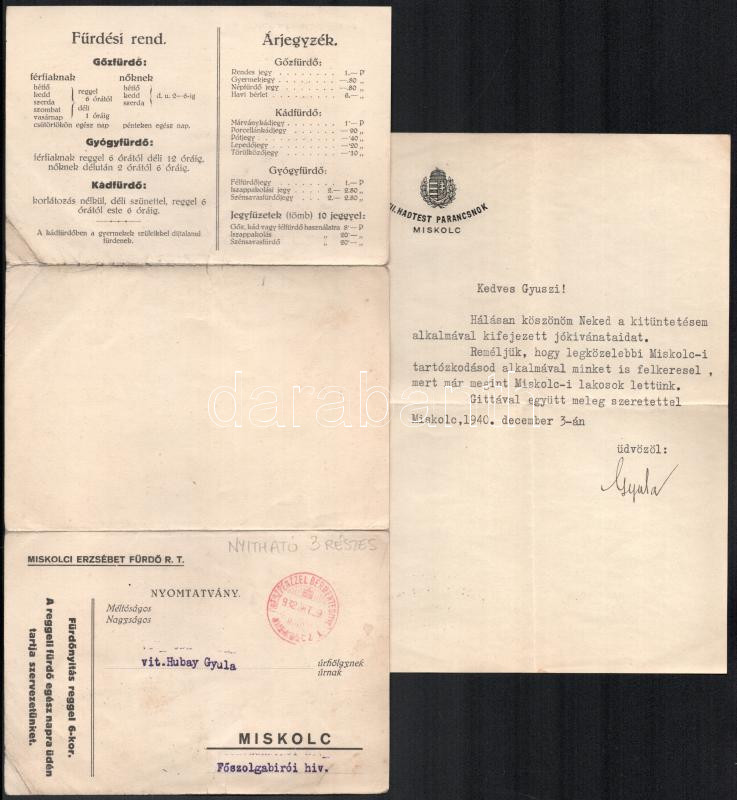 1932-1940 Miskolc, vitéz Hubay Gyula főszolgabíró hagyatékából 2 db irat (Miskolci Erzsébet Fürdő nyitható ismertetője, a miskolci VII. hadtest parancsnokától érkezett levél)