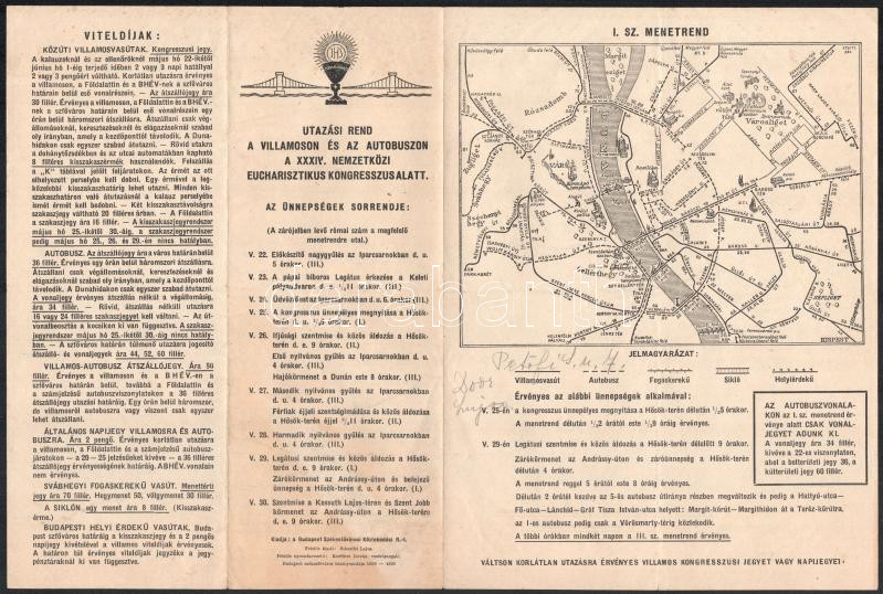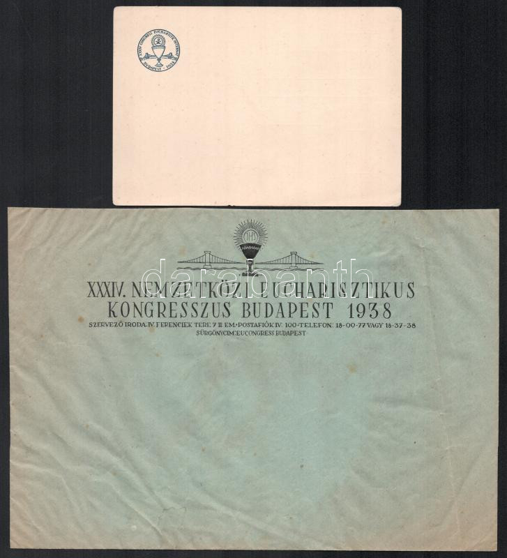 Beschreibung: 1938 A Budapesti Eucharisztikus Kongresszus programja térképes menetrenddel, levelezőlap és boríték, 3 db