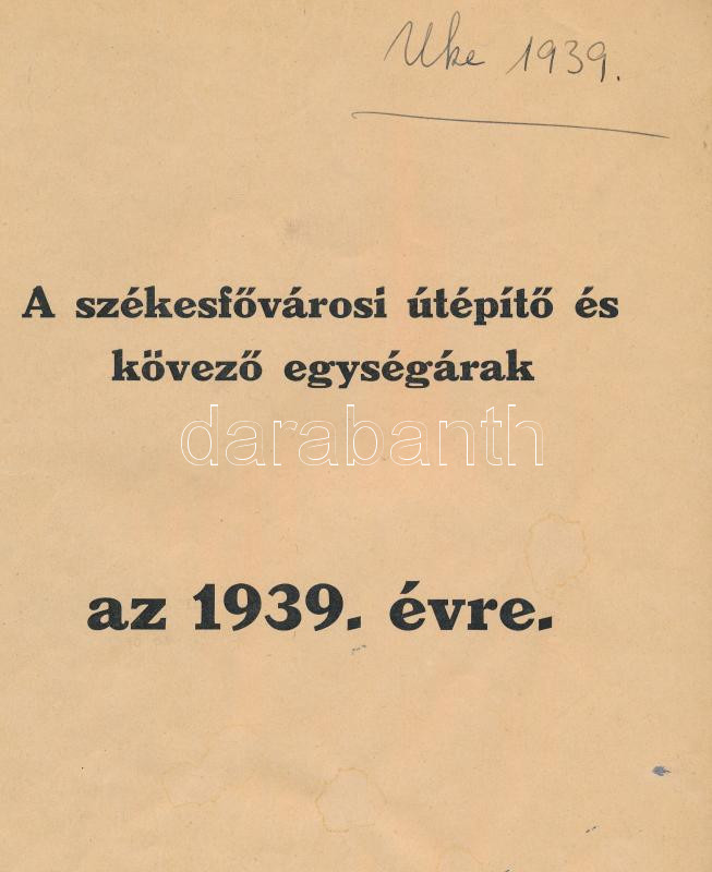 1939 A székesfővárosi útépítő és kövező egységárak az 1939. évre. Bp.,... https://www.darabanth.com/de/438-Fernauktion/438.0/Kunst-Dokumente-andere-Sammelgebiete/Drucksachen~1000005/1939-A-szekesfovarosi-utepito-es-kovezo-egysegarak-az-1939-evre-Bp-Szekesfovaros~II2795186