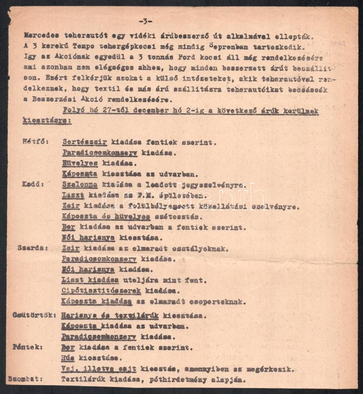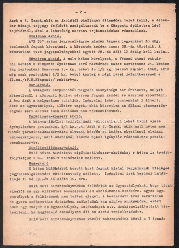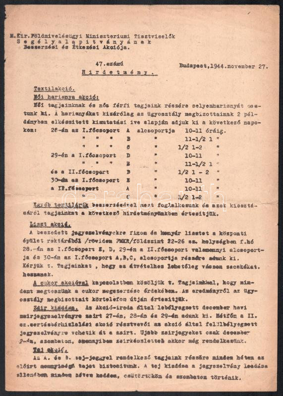 Beschreibung: 1944 M. kir. Földmívelésügyi Minisztériumi Tisztviselők Segélyalapítványának Beszerzési és Étkezési akciója, 3 p (2 lapon), apó lapszéli szakadásokkal