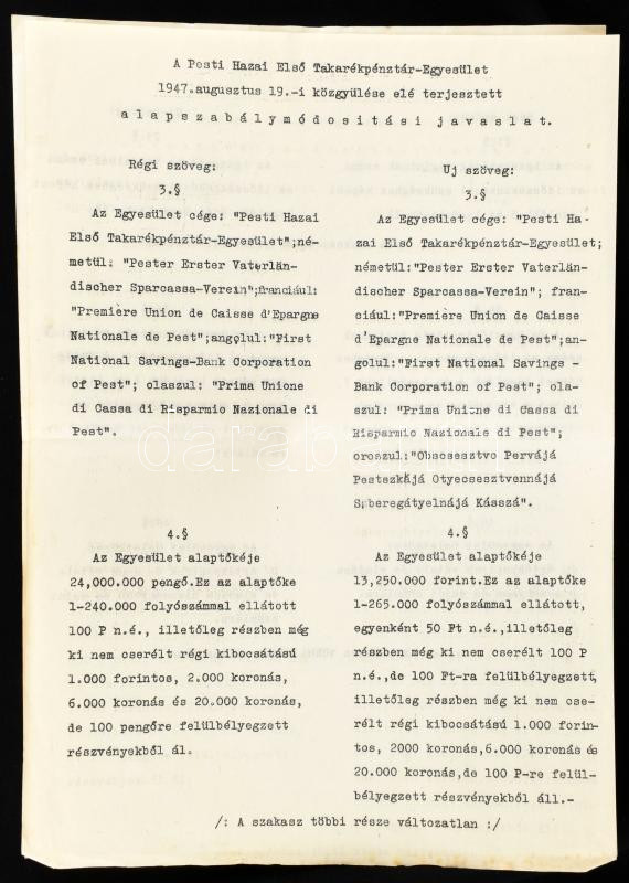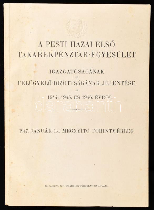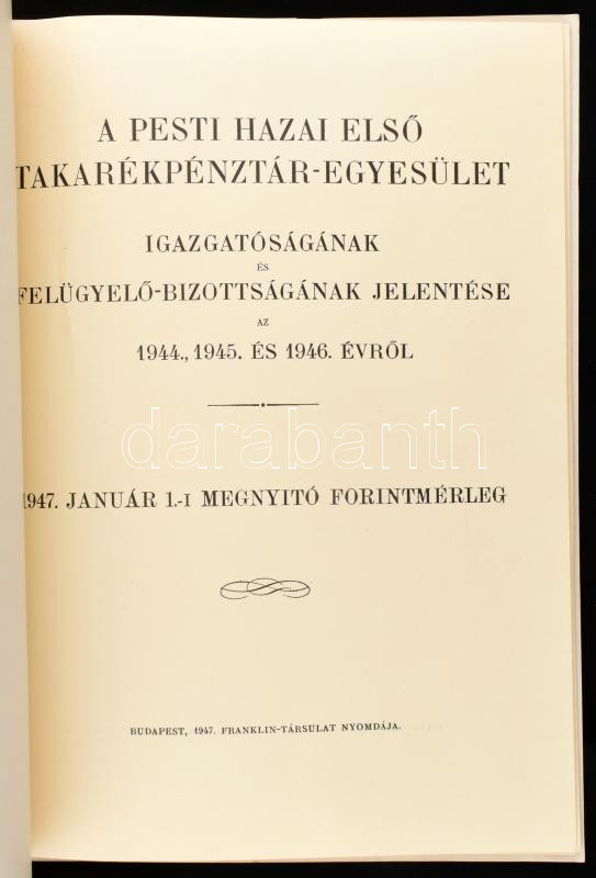 1947 Pesti Hazai Első Takarékpénztár-Egyesület igazgatóságának és felügyelő-bizottságának jelentése az 1944,1945 és 1946 évről. 1947 január 1. megnyitó forintmérleg. Bp., 1947. Franklin. 12 + 8 p.