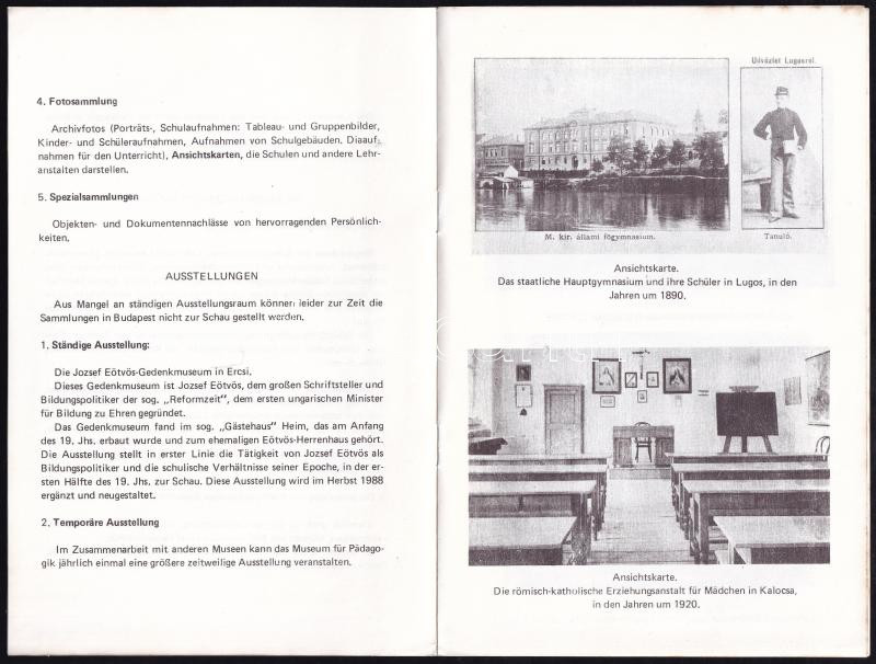 Beschreibung: 1988 Landesbibliothek und Museum für Pädagogik. Bp., 1988., német nyelvű fekete-fehér fotókkal illusztrált prospektus, kissé foltos.