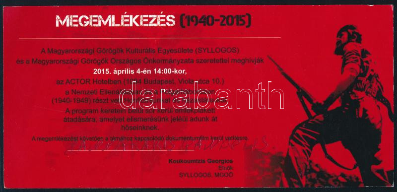 2015 Magyarországi görögök megemlékezésére szóló meghívó https://www.darabanth.com/de/438-Fernauktion/438.0/Kunst-Dokumente-andere-Sammelgebiete/Drucksachen~1000005/2015-Magyarorszagi-gorogok-megemlekezesere-szolo-meghivo~II2867419