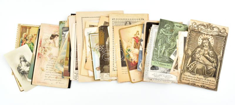 Beschreibung: 50 db régi szentkép (közte rézmetszetű, csipkés, litho), XIX. sz.-XX. sz. első fele, vegyes állapotban
