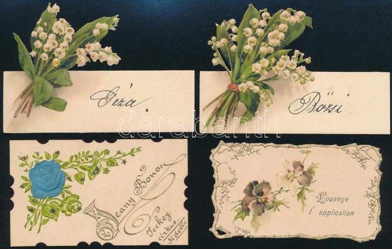 Beschreibung: cca 1900 Dombornyomású litho ültető- és üdvözlőkártyák, 4 db