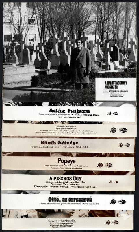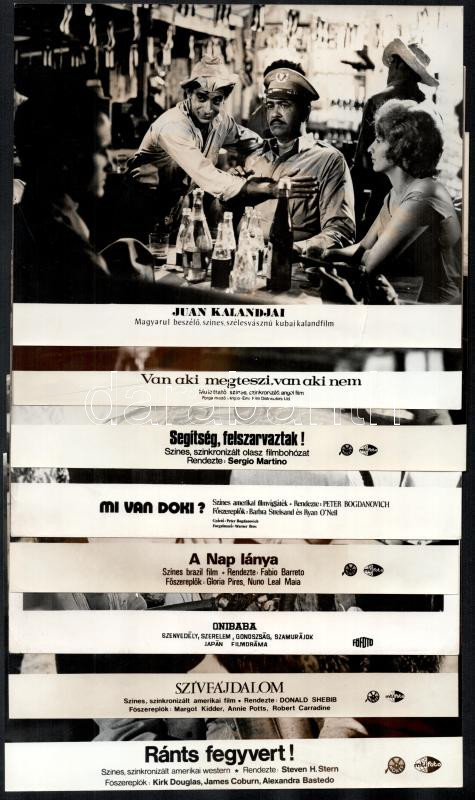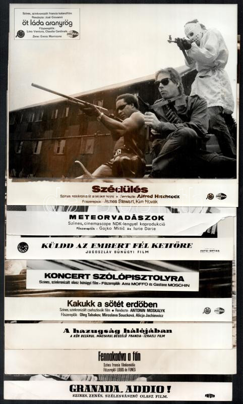 Hibás filmfotók tétele, cca 1988 előtt készült külföldi filmek egy-egy jelenete, 33 db vintage produkciós filmfotó, ezüst zselatinos fotópapíron, valamennyi képnek hibája van (elszíneződés, szakadás, kisebb hiány, hajtásnyom, stb.), 18x24 cm