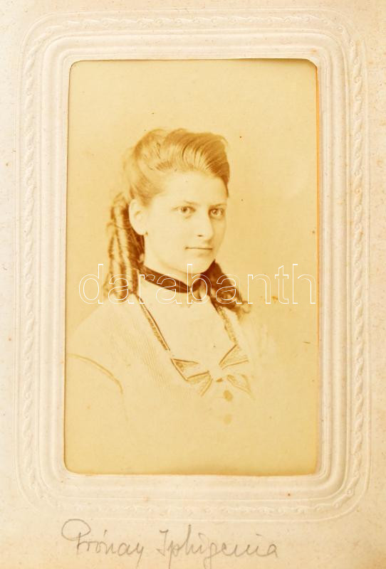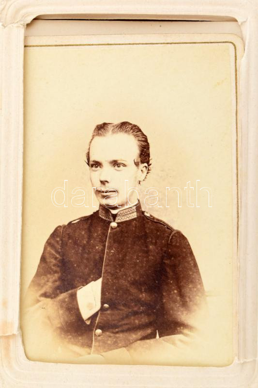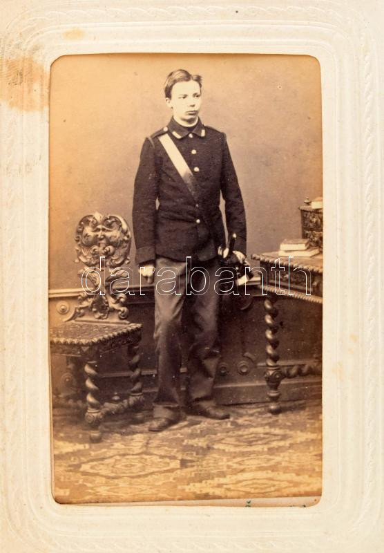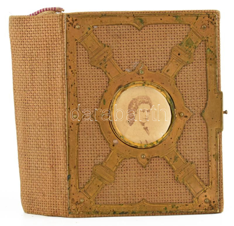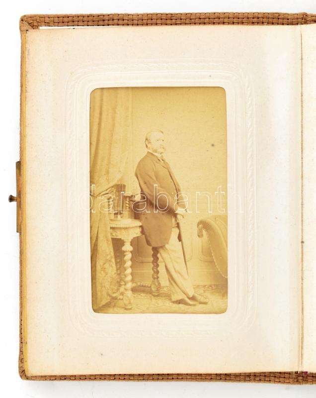 cca 1860-1890 Dekoratív rézveretes, vászonborítású fotóalbum, benne vizitkártyák magyar és külföldi műtermekből (Pest, Bécs, Temesvár, stb.), közte érdekesebb, nevesített személyek (vizmai Lukács Mór MTA-tag, Prónay család tagjai, stb.), egyenruhások, katonafotók; össz. 46 db. Az album sérült, lapjainak nagy része kijár.