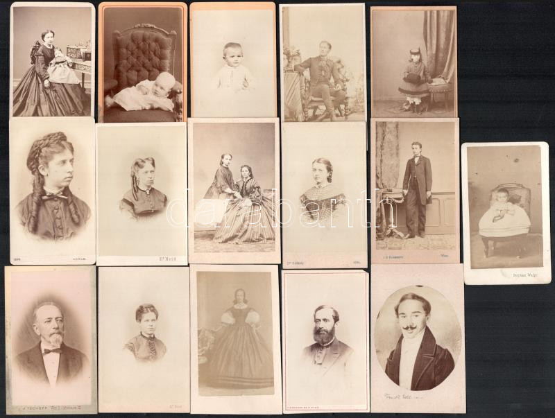 Beschreibung: cca 1865 16 db vizitkártya magyar és külföldi műtermekből, részben feliratozva, 10,5×6,5 cm
