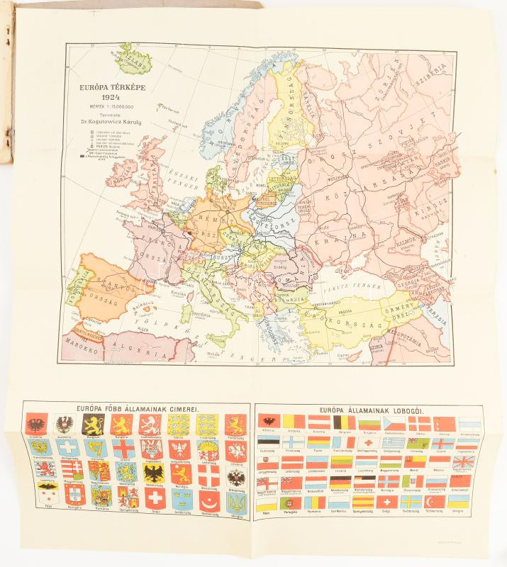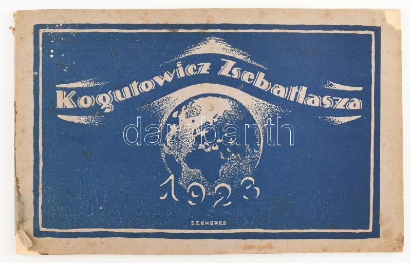 1923 Bp, Kogutowicz zsebatlasza az 1923. évre. II. évfolyam. Bp., Magyar Néprajzi Társaság Emberföldrajzi Szakosztálya,9-116 p +1 (Európa térképe 1924,1:15,000.000, tervezte: Kogutowicz Károly, 27x33 cm) t. Haránt alakú kiadói papírkötés, kissé szakadt, foltos borítóval, hiányzó lapokkal, a borító egyik sarkán kis hiánnyal.