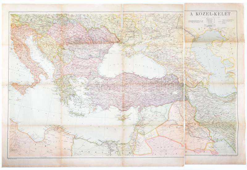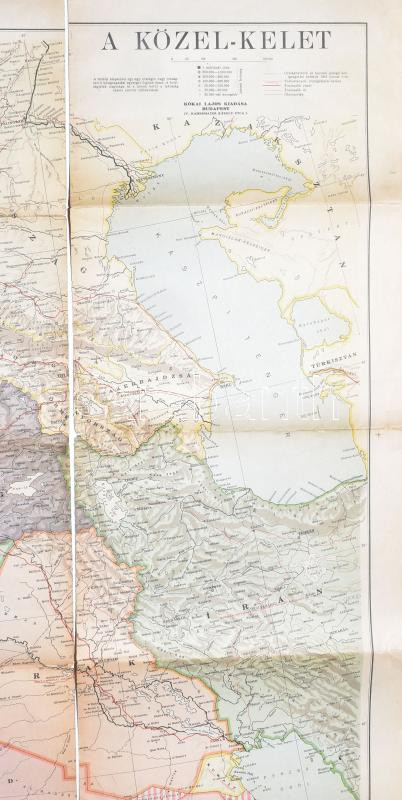 1943 Közel-Kelet, Olaszország, Balkán-félsziget, Kisázsia térképe, 1:3,400.000, Bp., Klösz-ny., javított, szakadt, sérült, rajta eredeti sérült kiadói szalaggal, 80x119 cm