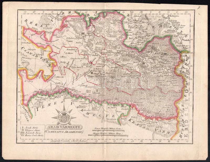cca 1802-1811 Arad vármegye (Comitatus Aradiensis) térképe, rajta: Arad, Világos és más települések, színezett rézmetszet, papír, In: Görög Demeter (1760-1833) "Magyar Atlasz azaz a' magyar-, horvát- és tótországi megyék és szabad kerületek földképei", 22x29 cm, 28x21 cm, lap: 26x34 cm