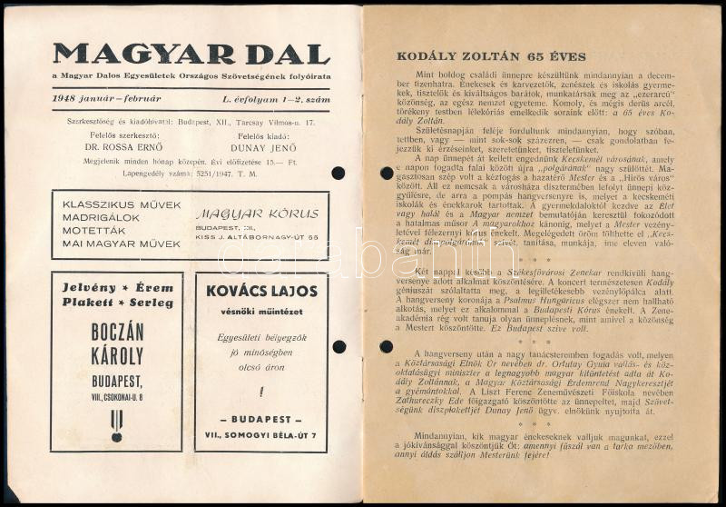 1948 Magyar Dal, a Magyar Dalos Egyesületek Országos Szövetségének folyóirata, L. évf. 1-2. sz., 1948. január-február. Bp., "Élet"-ny., 16 p. A címlapon a 65 éves Kodály Zoltán. Kiadói tűzött papírkötés, szélén lyukasztással.