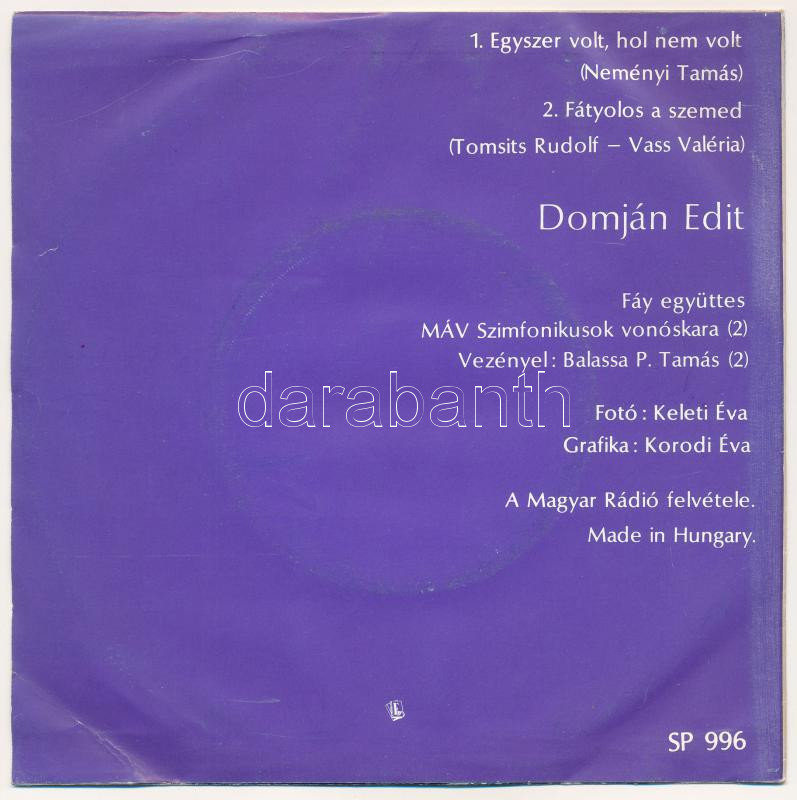 Domján Edit - Egyszer Volt, Hol Nem Volt. Vinyl, 7", 45 RPM, Sing... https://www.darabanth.com/de/438-Fernauktion/438.0/Kunst-Dokumente-andere-Sammelgebiete/Musik-Schalplatten-und-CD-s-DVD-s~1000007/Domjan-Edit-Egyszer-Volt-Hol-Nem-Volt-Vinyl-7-45-RPM-Single-Mono-Pepita-Magyarorszag~II2870298
