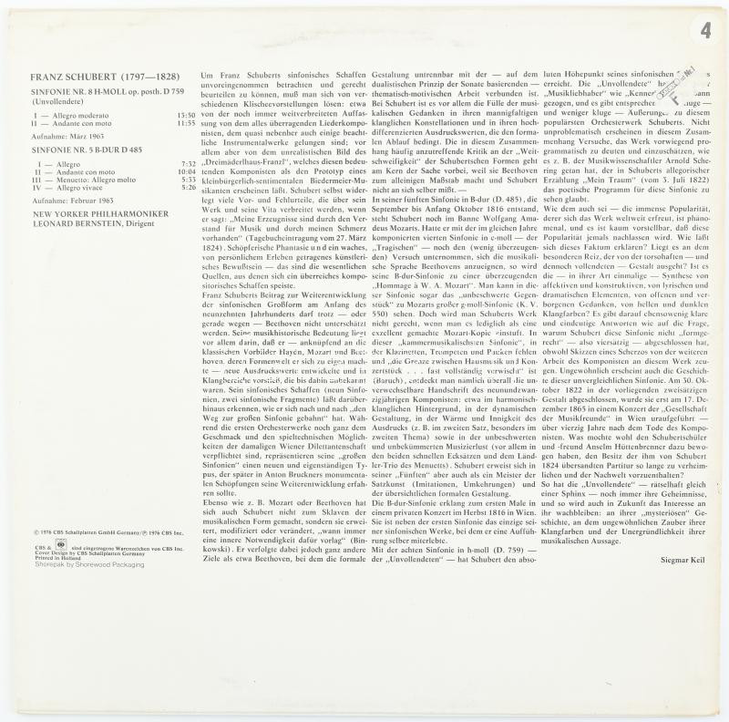 Franz Schubert, Leonard Bernstein, New Yorker Philharmoniker - Sinfonien Nr. 5 B-Dur D 485 Und Nr. 8 H-Moll Op. Posth. D 759 (Unvollendete). Vinyl lemez, LP, Stereo, CBS - 61691, Németország/Germany, 1976