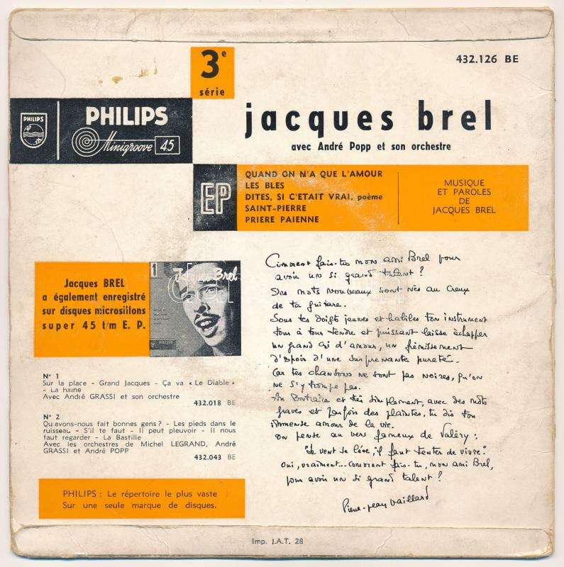 Jacques Brel - 3. Vinyl, 7", 45 RPM, EP. Philips, Franciaország, ... https://www.darabanth.com/de/438-Fernauktion/438.0/Kunst-Dokumente-andere-Sammelgebiete/Musik-Schalplatten-und-CD-s-DVD-s~1000007/Jacques-Brel-3-Vinyl-7-45-RPM-EP-Philips-Franciaorszag-1957~II2870220