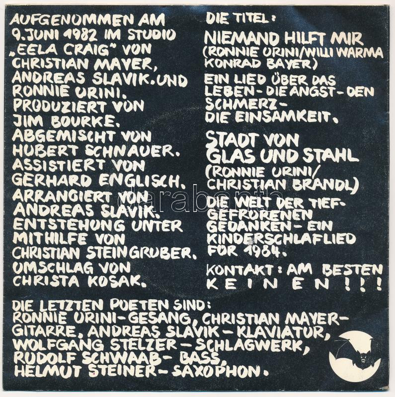 Ronnie Urini & Die Letzten Poeten - Niemand Hilft Mir. Vinyl, 7&qu... https://www.darabanth.com/de/438-Fernauktion/438.0/Kunst-Dokumente-andere-Sammelgebiete/Musik-Schalplatten-und-CD-s-DVD-s~1000007/Ronnie-Urini-Die-Letzten-Poeten-Niemand-Hilft-Mir-Vinyl-7-45-RPM-Single-DAda-2-Ausztria~II2870239