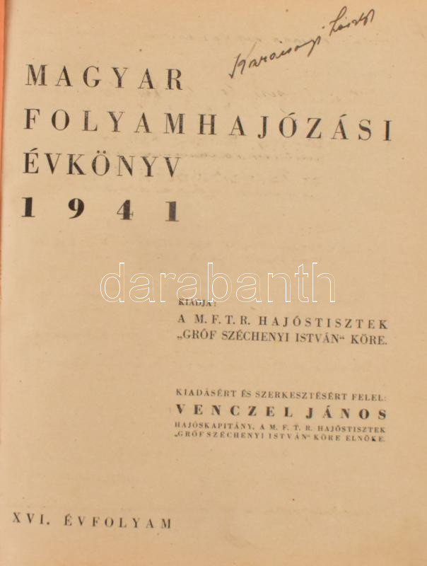 1941 Magyar folyamhajózási évkönyv, Venczel János (szerk.), Budapest 1... https://www.darabanth.com/de/438-Fernauktion/438.0/Kunst-Dokumente-andere-Sammelgebiete/Schiffe-Plattensee~500029/1941-Magyar-folyamhajozasi-evkonyv-Venczel-Janos-szerk-Budapest-1941-A-M-F-TR-hajosti~II2865467