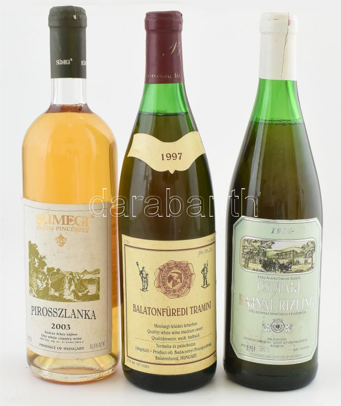 3 db magyar fehérbor: csopaki rajnai rizling, balatoni tramini, piross... https://www.darabanth.com/de/438-Fernauktion/438.0/Kunst-Dokumente-andere-Sammelgebiete/Vintage-Weine-Getranke~500017/3-db-magyar-feherbor-csopaki-rajnai-rizling-balatoni-tramini-pirosszlanka~II2858244