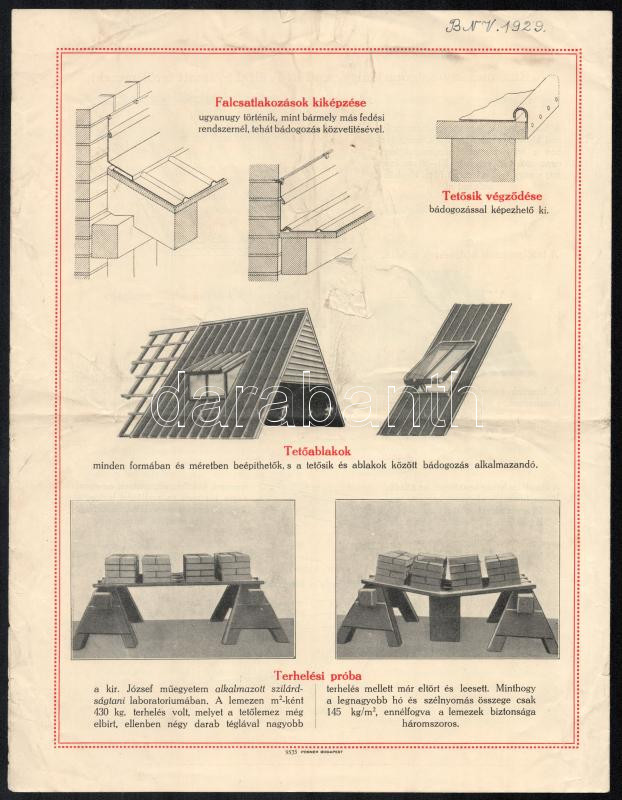 cca 1925 Tetőfedés vaslemezzel - Vasgerendákat Árusító Rt. reklámlap, ... https://www.darabanth.com/de/438-Fernauktion/438.0/Kunst-Dokumente-andere-Sammelgebiete/Werbungen~500024/cca-1925-Tetofedes-vaslemezzel-Vasgerendakat-Arusito-Rt-reklamlap-szakadassal-hajtott~II2867053