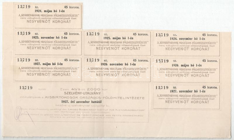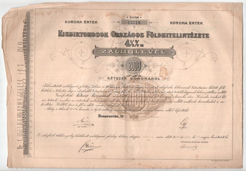 Budapest 1917. "Kisbirtokosok Országos Földhitelintézete" 4 1/2%-os záloglevele 2000K-ról, magyar, német és francia nyelven, szárazpecséttel, szelvényekkel T:F fo.