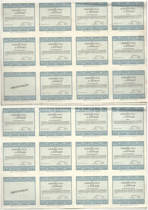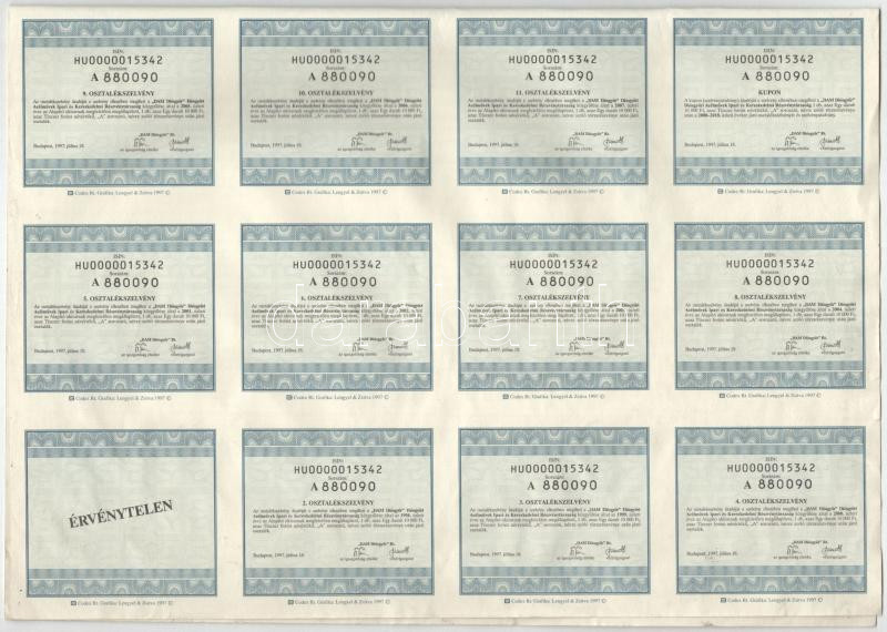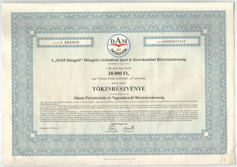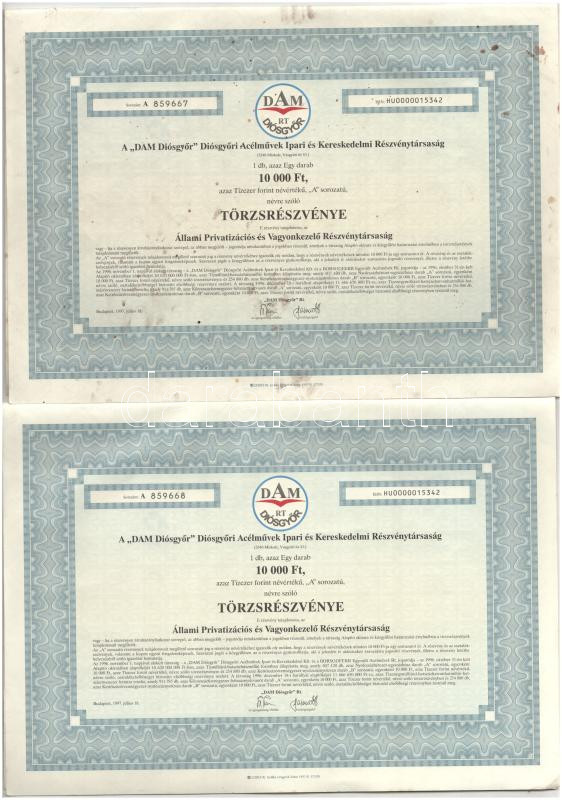 Budapest 1997. "A 'DAM Diósgyőr' Diósgyőri Acélművek Ipari és Kereskedelmi Részvénytársaság" törzsrészvénye 10.000Ft-ról (3x) "A" sorozatszámmal, közte egy sorszámkövető párral, szelvényekkel T:VF folt
