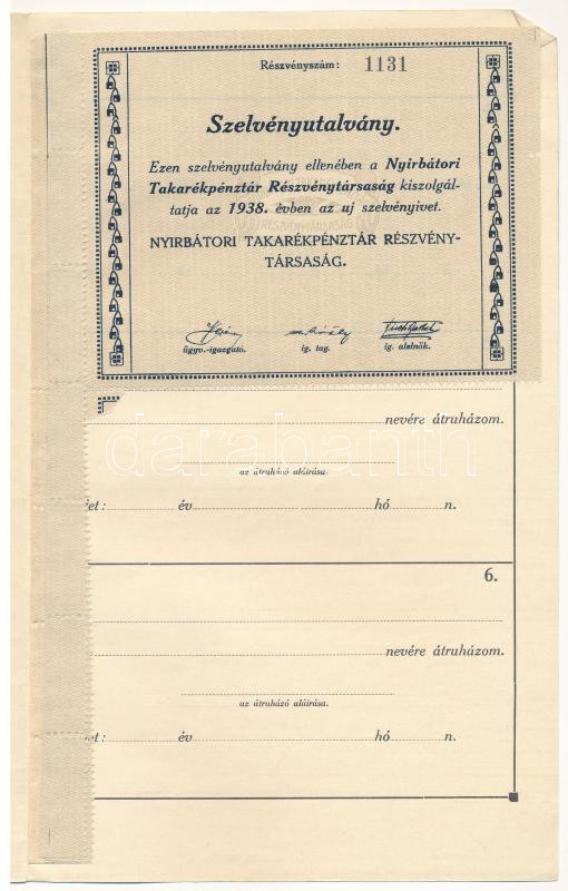 Nyírbátor 1912. "Nyírbátori Takarékpénztár Részvénytársaság"... https://www.darabanth.com/de/438-Fernauktion/438.0/Numismatik/Aktien-und-Tickets~1500005/Nyirbator-1912-Nyirbatori-Takarekpenztar-Reszvenytarsasag-nevre-szolo-reszvenye-3~II2866294