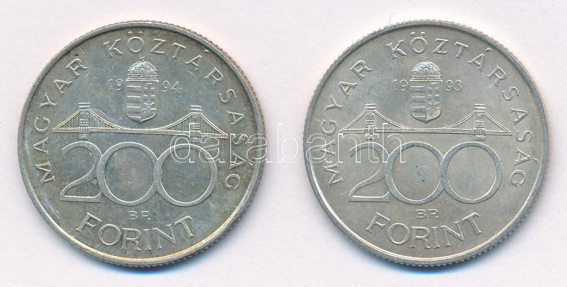 1993. 200Ft Ag "MNB" + 1994. 200Ft Ag "Deák" T:AU,... https://www.darabanth.com/de/438-Fernauktion/438.0/Numismatik/Ungarische-Munzen-und-Munzen-mit-ungarischem-Munzzeichen~1500008/1993-200Ft-Ag-MNB-plus-1994-200Ft-Ag-Deak-TAU-XF-patina-Adamo-F13-F131~II2855556