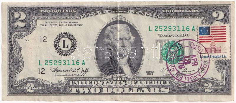 Amerikai Egyesült Államok 1976. (1976) 2$ "Federeal Reserve Note" zöld pecsét, "Francine Irving Neff - William E. Simon", 13c bicentenáriumi bélyeggel és elsőnapi bélyegzéssel "LOS ANGELES CA SIA. 15" T:XF,VF
