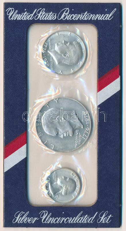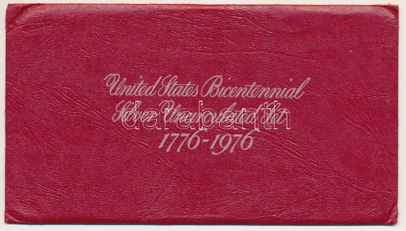 Amerikai Egyesült Államok 1976S 1/4$ Ag "Washington" + 1/2$ Ag "Kennedy" + 1$ Ag "Eisenhower" "Bicentennial" szettben, műanyag vákuum csomagolásban és karton keretben, angol nyelvű tájékoztatóval, eredeti piros műbőr borítékban T:UNC,AU kissé viseltes boríték