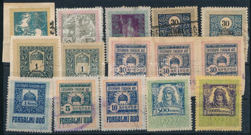 Beschreibung: 1913-1923 15 db magyar illetékbélyeg és forgalmi adó bélyeg