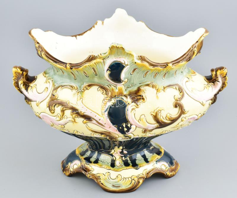 Beschreibung: Régi fajansz jardiniere, kézzel festett, jelzett: Julius Dressler, kopásokkal, m: 27 cm, d: 38 cm